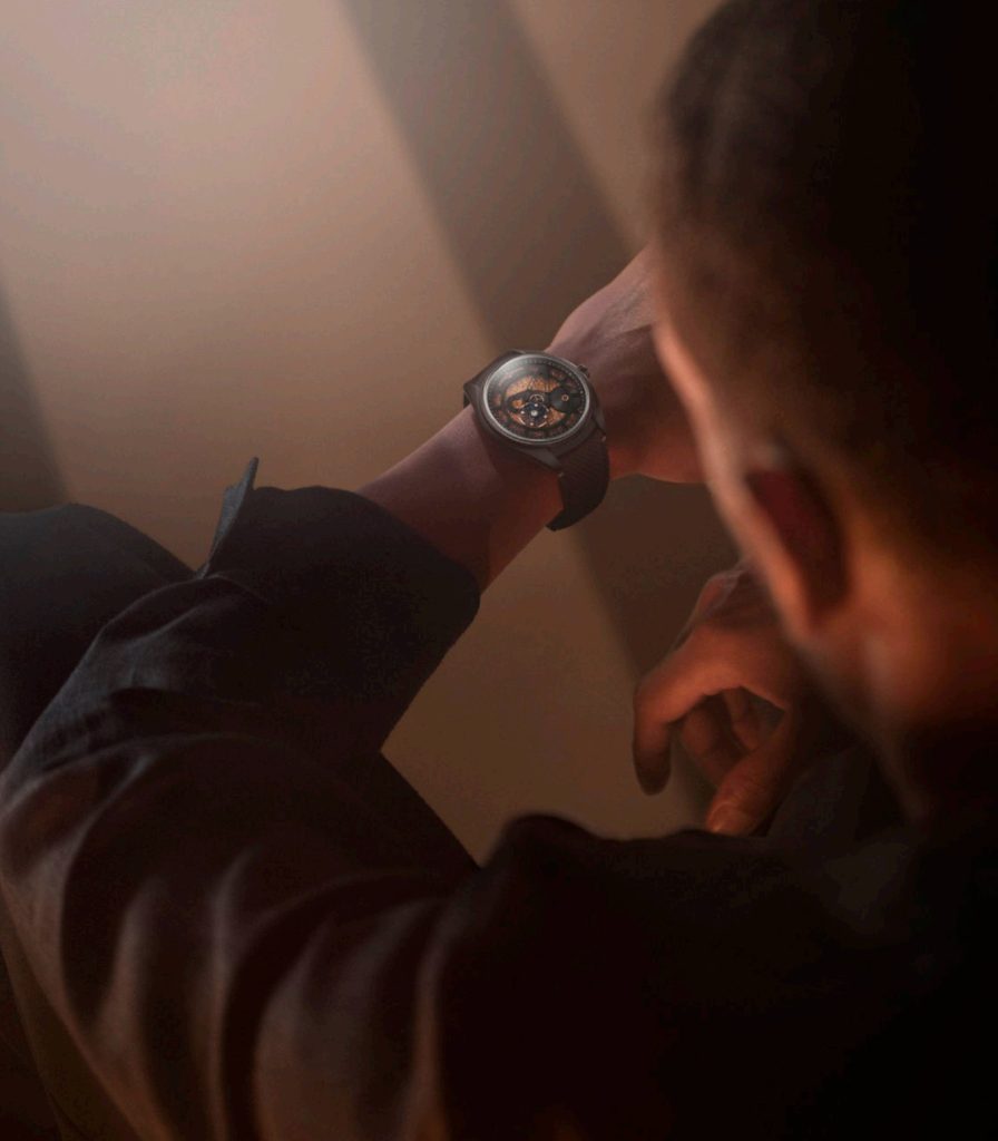 机芯内部搭载的硅质擒纵机构及摆轮游丝,均由雅典表旗下专注精密硅晶体零件制作的瑞士 Sigatec 公司打造 —— 这一专属供应链,确保了硅材质在抗磁、防腐蚀及精准度上的卓越性能。更具巧思的是时间指示设计:承载核心零件的桥板兼作分针,每小时围绕轴心旋转一圈;而下方的钌晶体小时盘则直接作为时针,每 12 小时完成一次完整转动。当腕表运行时,飞行卡罗素的旋转与表盘的转动相互配合,宛如一场精妙的 “机械之舞”,让读时过程成为视觉享受。