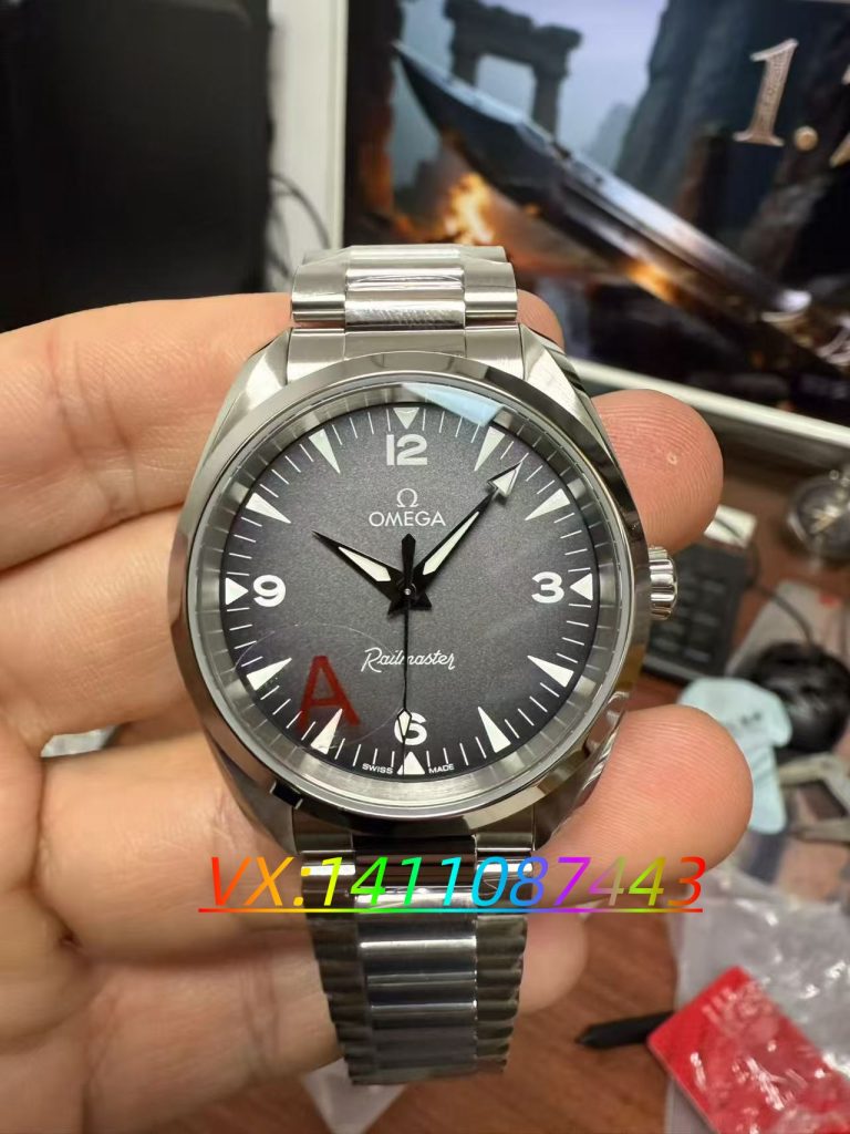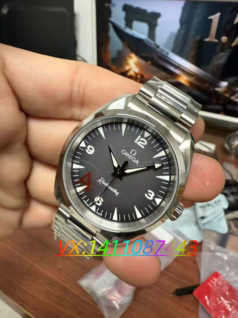 表盘细节是复刻表的“灵魂”,这款铁霸的表盘采用独特的黑灰渐变设计,光线昏暗时呈现深邃的黑色,强光下则透出细腻的灰色调,视觉层次丰富。表盘纹路采用化学蚀刻工艺打造,中心拉丝、两侧抛光的处理方式,让盘面在不同角度下呈现出多样的光影效果,还原度极高。刻度采用油压立体印刷工艺,字迹饱满清晰,边缘规整无晕染,且刻度与指针均做了精抛打磨,棱角圆润,无任何毛刺毛躁感。值得一提的是,刻度与指针内部填充的夜光粉均匀饱满,夜光涂层边界清晰,黑暗环境下呈现出清晰的蓝绿色夜光效果,读时便捷直观,延续了铁霸系列的实用属性。表盘中央的欧米茄“马蹄标”logo立体感十足,字体刻字精准,与原版完全对版,细节处尽显匠心。