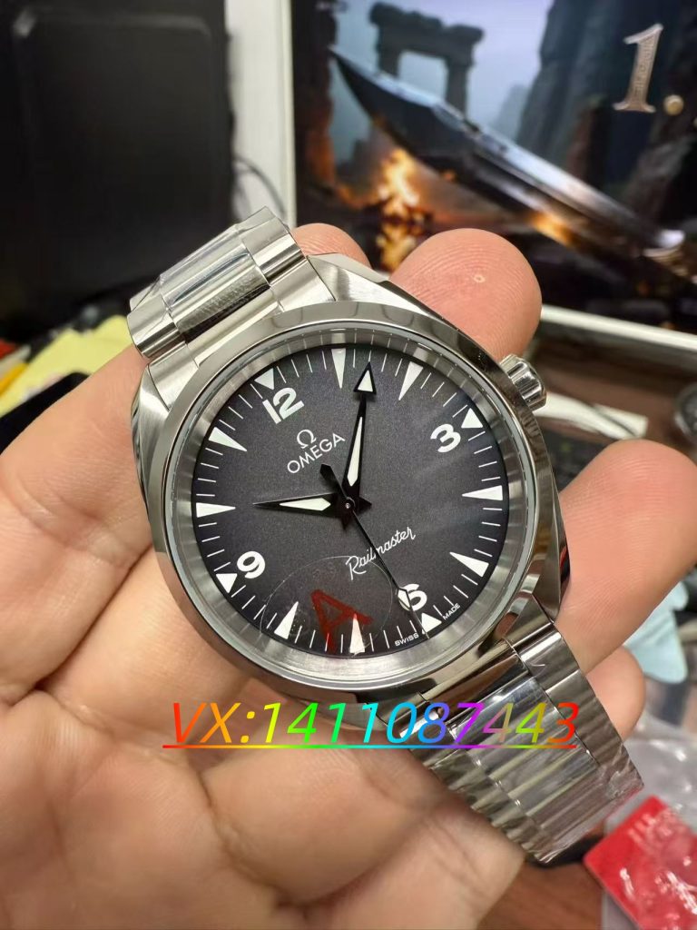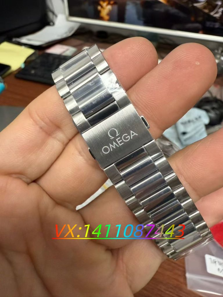 表带与表扣的做工同样可圈可点,钢带采用与表壳同源的316精钢材质,节间连接紧密,开合顺畅无卡顿。表带同样采用拉丝工艺,与表壳质感保持一致,表扣为经典的折叠扣设计,内部刻字清晰完整,开合力度适中,扣合后牢固可靠,不易松动。表冠设计符合欧米茄经典风格,顶部logo雕刻立体清晰,旋入式结构紧密贴合表壳,保障了150米的防水性能。表冠的阻尼感适中,调节时间时手感顺滑,无明显的卡顿或空转现象,体现了机芯与表冠连接的精准度。