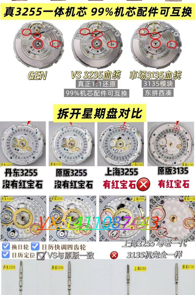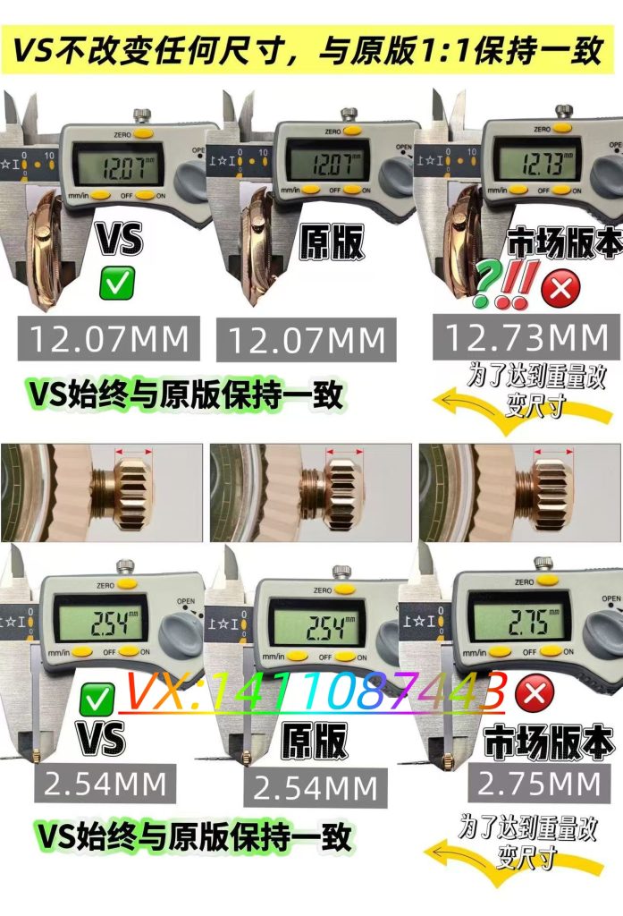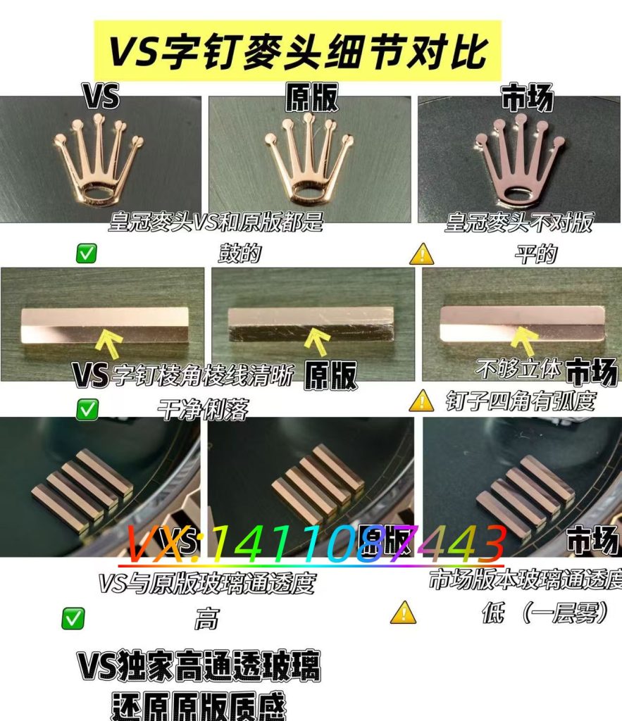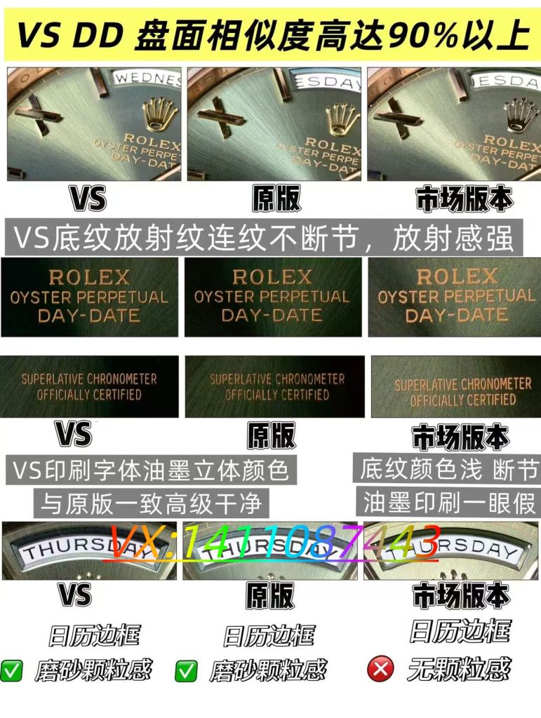 表盘细节延续VS厂一贯的高水准,放射纹盘面细腻规整,随光线角度变化呈现出柔和的光影流动效果,高级感十足。条钉刻度立体饱满,经过台阶式打磨与夜光填充,夜间点亮后呈现均匀的冰蓝色夜光,可读性极佳。指针边缘光滑无毛刺,中轴升级为圆锥形镂空设计,与新款原版完全对版,细节之处尽显匠心。星期与日历窗口居中对齐,搭载2.5倍放大蓝膜镜片,日历字体油墨饱满,符合劳力士经典的“上小下大”字体特征,仿真度拉满。