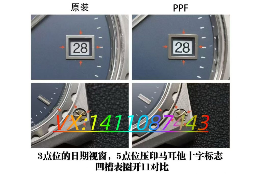 表壳工艺的细节差异是首要破绽。原厂4200采用37mm一体成型酒桶形表壳,通过精密微喷丸技术处理,配合上千次垂直锻面拉丝与抛光打磨,呈现出均匀细腻的金属质感,边角过渡圆润无棱角。尤其5点钟位置的马耳他十字印记,原厂采用压印工艺,边缘清晰规整,与表壳弧度完美契合。而PPF厂复刻款虽模仿了整体造型,但拉丝纹理存在明显差异,部分区域出现纹理紊乱或深浅不均的情况。更关键的是,其马耳他十字印记边缘略显毛糙,压印深度不足,在光线折射下立体感远逊于原厂,且表壳接缝处的严密性稍差,转动表冠时能感受到细微的松动感。