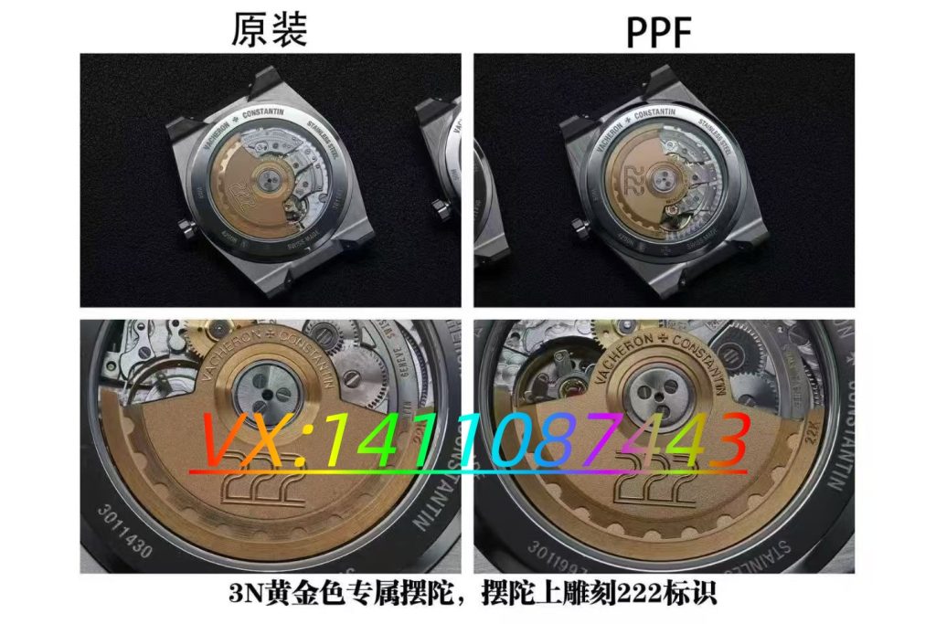 机芯性能与工艺是最核心的破绽所在。原厂4200搭载2455/2型自制机芯,直径26.2mm,厚度仅3.6mm,含194个零件与27颗宝石,振频28800VPH,动力储存40小时,且带有日内瓦印记,机芯夹板采用手工抛光倒角,纹路细腻规整,22K金自动陀上的“222”标识字体与原型表完全一致。PPF厂虽宣称搭载自制2455/2机芯,但实际为9015机芯加夹板改装而来。其机芯厚度与原厂虽相近,但细节处理差距显著:夹板倒角为机加工打磨,存在明显“震刀纹”,无手工抛光痕迹;自动陀材质并非22K金,重量偏轻导致上链效率较低,动力储存实际仅35小时左右;“222”标识字体与原厂存在差异,雕刻深度不足,边缘不够清晰,且缺失关键的日内瓦印记认证。