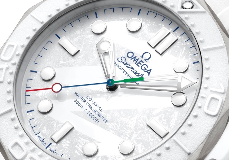 为精准诠释冬日冰雪的纯粹与灵动,欧米茄匠心甄选白色陶瓷与5级钛金属两大优质材质打造腕表主体,既赋予腕表晶莹光滑的视觉质感,又兼具轻盈便携与坚固耐用的实用特性,完美适配冬季运动的场景需求。腕表表面采用多道精细化打磨工艺,形成丰富的视觉对比:表壳经抛光与拉丝双重处理,光泽细腻且层次分明;排氦气阀门与表冠采用喷砂工艺,触感细腻柔和;白色陶瓷表圈则通过激光烧蚀浮雕工艺镌刻潜水刻度,细节之处尽显制表工艺的精湛。
