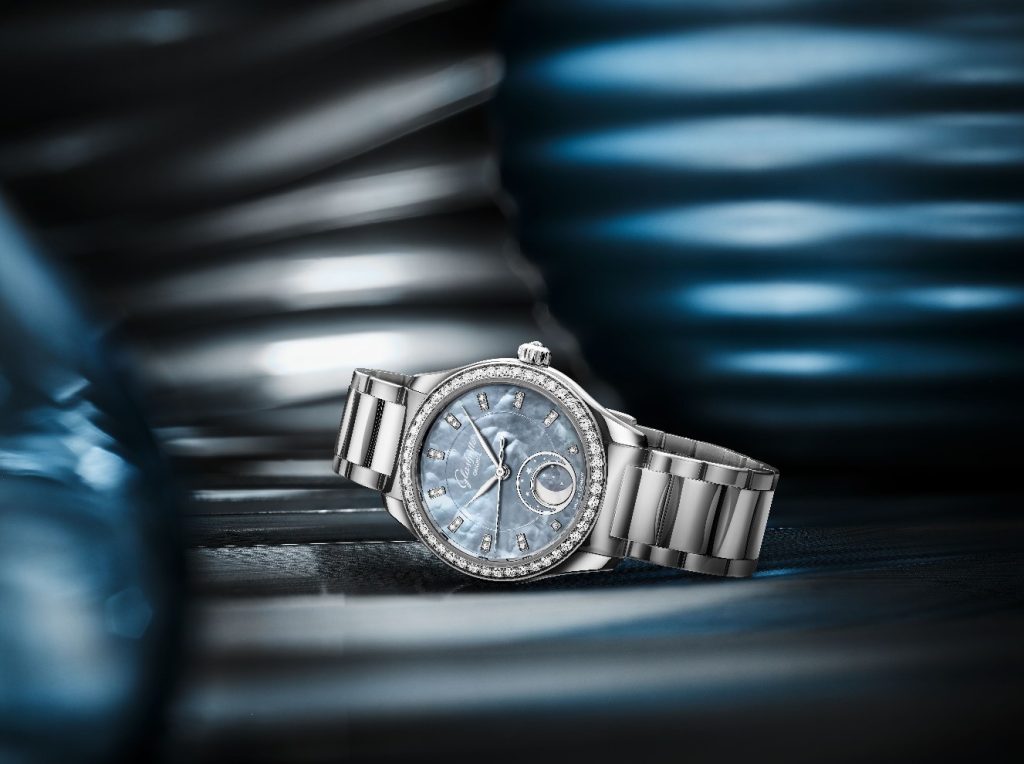 心蕴万象,自成光华。这枚腕表,是优雅与独特的共生,是精致与坚韧的融合,完美诠释当代女性的多元魅力,从容绽放不被定义的气质。超薄珍珠母贝表盘暗藏巧思,背面经数层深色漆面悉心涂覆,与珍珠母贝本身的天然莹润光泽交相辉映,随光影流转,色彩便从清浅银蓝缓缓晕染成浓郁烟蓝——这正是都市天际线的灵动写照:平视时,玻璃幕墙映出纯粹澄澈的蓝;抬眼间,流云掠过,又在镜面上投下万千变幻的光影。格拉苏蒂原创巧妙捕捉这份轻灵缥缈的诗意,将现代建筑的恒久磅礴与天空的澄澈悠远,一同凝刻在这方寸表盘之上。